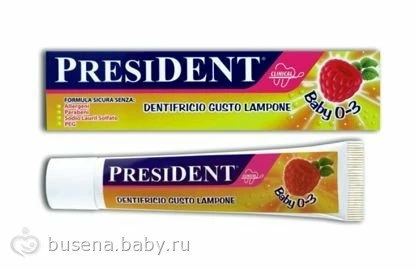 Зубные пасты Президент изготовляются в Италии, в состав средства предназначенного для деток от 0 до 3 лет не входят фторсодержащие компоненты, поэтому они абсолютно безопасны при случайном проглатывании. Благодаря ксилитолу расщепляют пищевые кислоты в полоти рта и обладают кариостатическим действием, причем у пасты, разработанной для детей от 6 до 12 лет, это действие несколько ниже выражено. Гель-паста от 6 до 12 лет напротив предназначена для деток, страдающих от кариеса, и содержит достаточно большое (до 960) количество фтора в виде фторида и монофторфосфата. Все пасты обладают выраженными приятными вкусами и ароматами 0-3 – малина, 3-6 – кола. 6-12 – лайм. Цена этих паст более чем демократична.