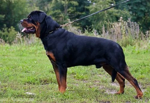 Для представителей породы характерно очень крепкое телосложение, выносливость в работе. Высота в холке достигает до 62 см, а вес – до 50 кг. Характер у ротвейлеров непростой, поэтому к их воспитанию необходимо подходить крайне серьезно и ответственно. Такая собака может стать прекрасным охранником и терпимо относиться к другим людям и животным при условии адекватной дрессировки. Содержать это животное в квартире несколько проблематично, поскольку ему необходима постоянная физическая активность, лучше предложить ему вольер.