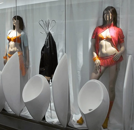 Эти немецкие архитекторы пошли еще дальше. Что там полуобнаженные манекены! Здесь писсуары в виде дамских ртов. Кстати, в некоторых европейских городах в судебном порядке запрещают использовать эту часть женского организма (разумеется, символическую, рукотворную) для столь низменных целей. Тем не менее, некоторым гражданам нравится посещать подобные клозеты. Возможно, так они самоутверждаются.