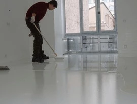 Есть еще одна разновидность наливных полов с улучшенными характеристиками – полимерцемент. В его основе лежит именно цемент, так что материал остается паропроницаемым. Но в состав входят также специальные полимерные химические добавки, которые подбираются комплексно. Благодаря этому система получается модифицированной, позволяет создавать наливные полы толщиной от 5 мм. Такие полы паропроницаемы, очень прочны на сжатие и изгиб, устойчивы к истиранию, пожаробезопасны. Система является самовыравнивающейся. Ремонт достаточно прост. Цветовых решений очень много.