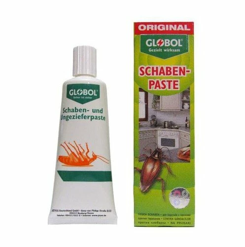 На сегодняшний день немецкая паста Глобол является одним из самых популярных и сильнодействующих средств при борьбе с тараканами. Действующее вещество пасты – хлорпирифос (в концентрации 0,5%) имеет IV класс токсичности и, как утверждает производитель, совершенно безопасно для людей и домашних питомцев (тем не менее контакта с ним лучше избегать). Паста наносится небольшими горошинами в местах обитания насекомых. Тараканы, поедая пасту и перенося ее частички на лапках к сородичам, начинают погибать уже через несколько часов. Максимальный эффект достигается через две недели.