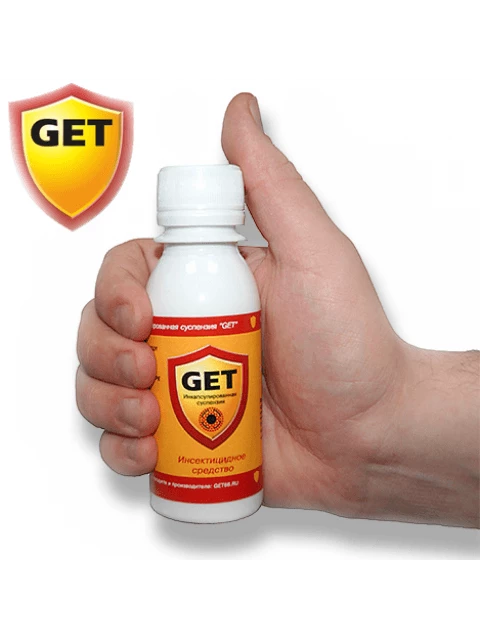 Get – это аналог высокоэффективного и популярного средства Gett, которое в настоящий момент сняли с продажи. Get – это контактный инсектицидный препарат широкого спектра действия (уничтожает тараканов, клопов, муравьев и других насекомых), работающий также и барьерным методом, т. е. предотвращает проникновение насекомых в дом. Действующее вещество – хлорпирифос – безопасно для человека и домашних животных. Средство разводится в воде (в концентрации 1:10 – один флакон на литр воды), после чего распыляется по тем поверхностям, где проползают насекомые. В течение месяца абсолютно все особи погибают. Get можно использовать и для приготовления приманок, что значительно ускорит выведение вредителей.