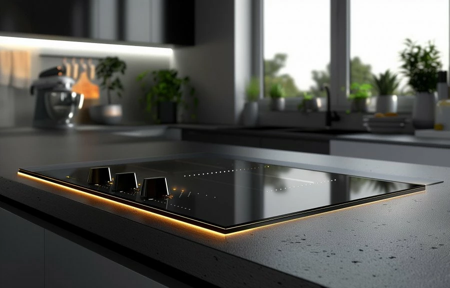 черный/белый цвет, другой дизайн с круглыми маркерами конфорок, скошенной шлифованной передней кромкой